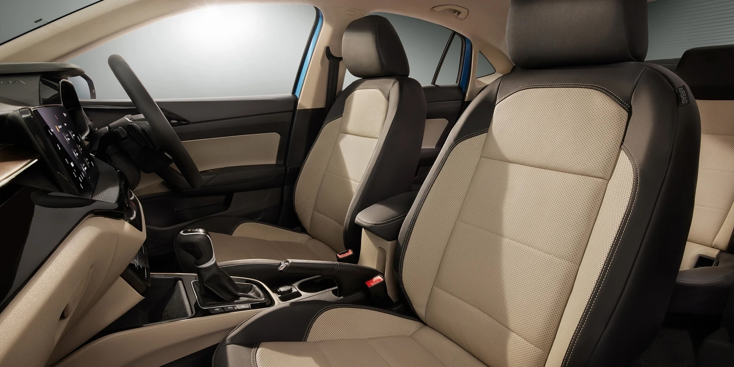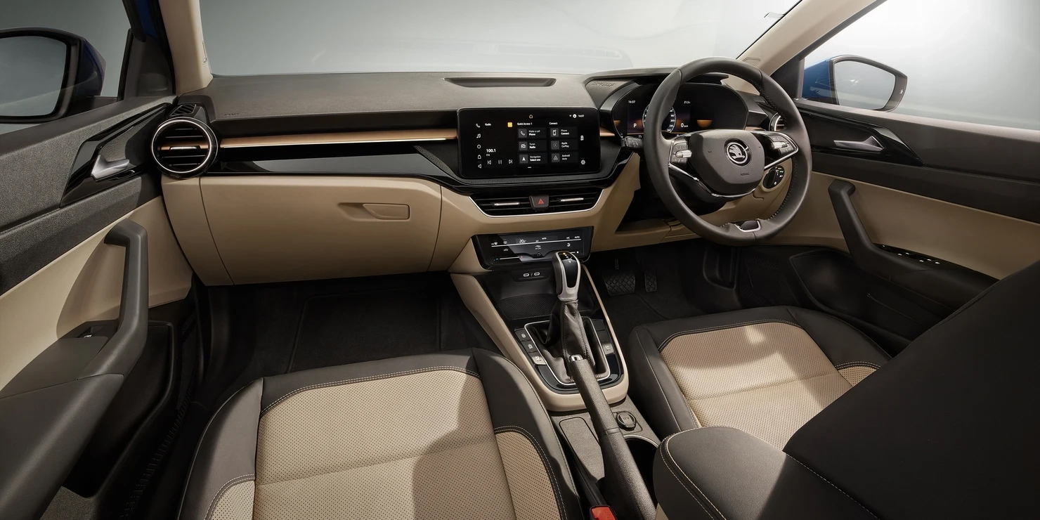 Nội thất của Slavia tại thị trường Ấn Độ khá hiện đại. Các trang bị cơ bản của Skoda Slavia như chìa khóa thông minh, khởi động bằng nút bấm, đồng hồ tốc độ 3,5 inch sau vô-lăng, màn hình giải trí 7 inch cảm ứng, âm thanh hai loa.