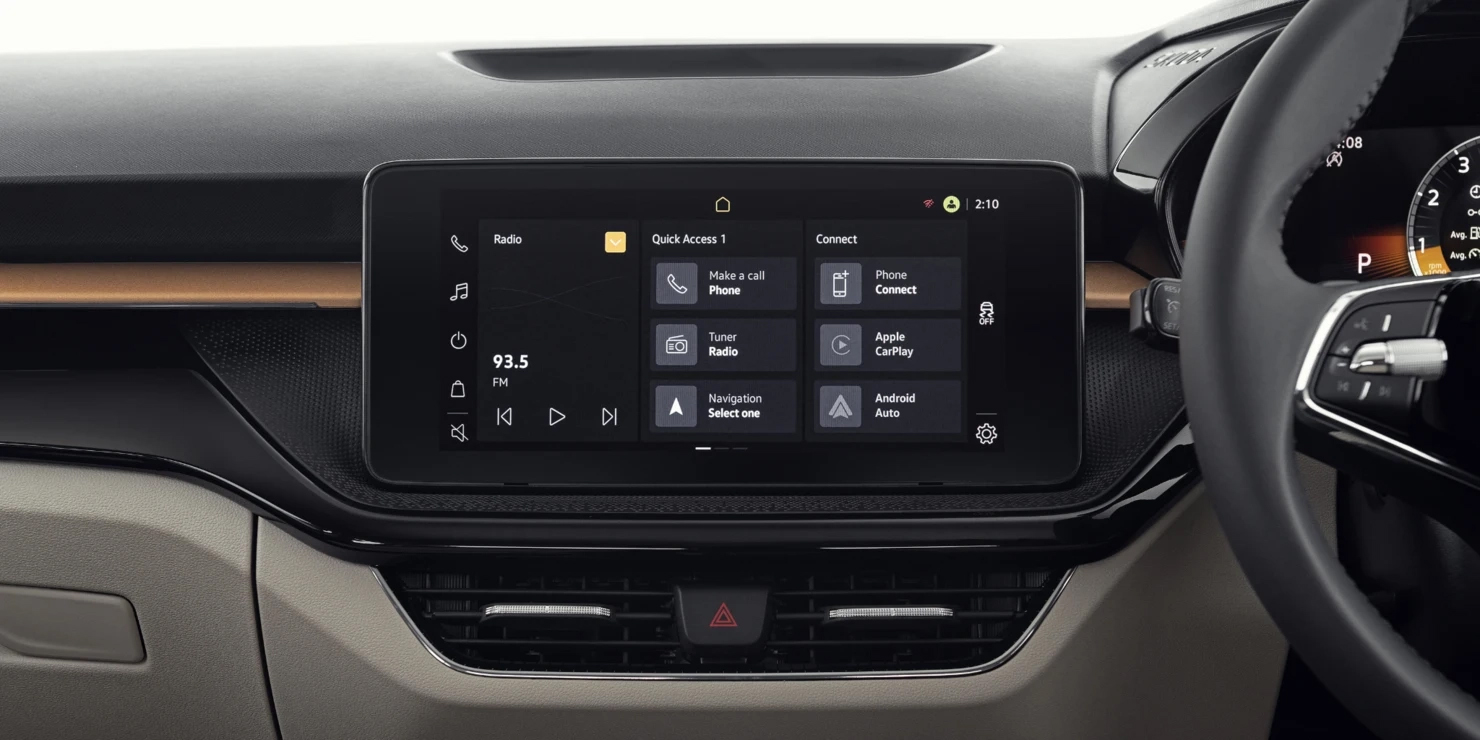 Các bản cao của Slavia lắp màn hình trung tâm 10 inch kết nối điện thoại thông minh, âm thanh 4 loa. Điều hòa tự động điều khiển bằng cảm ứng, cửa sổ trời, sạc không dây.