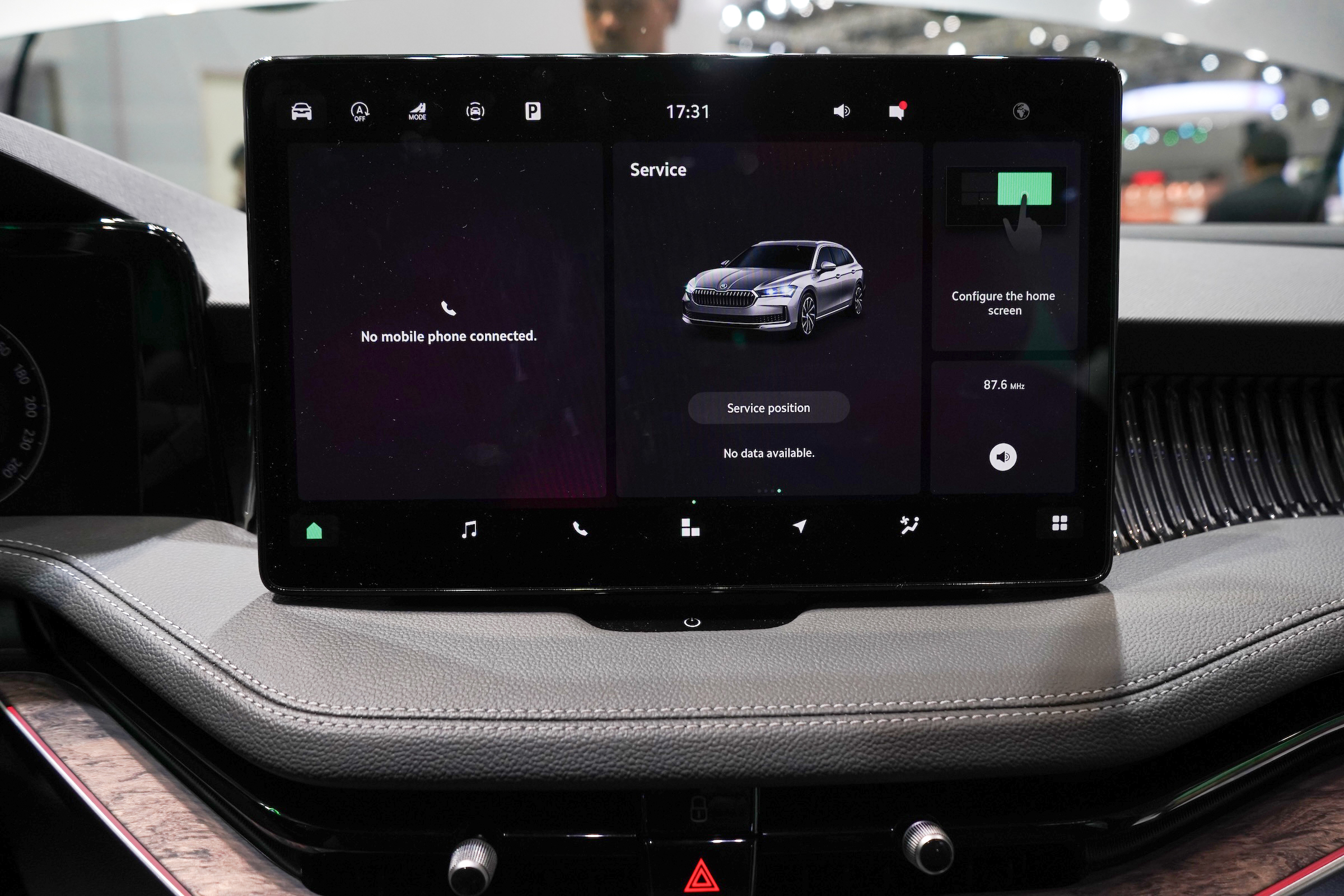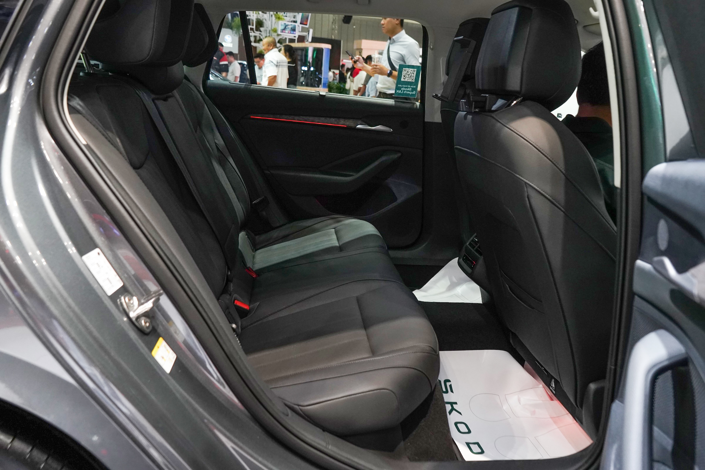 Vô-lăng của Superb bọc da, ốp viền crôm xung phanh các nút bấm. Bản này có các trang bị như màn hình HUD trên kính lái, đèn viền nội thất, điều hòa ba vùng độc lập, đồng hồ tốc độ 10 inch.